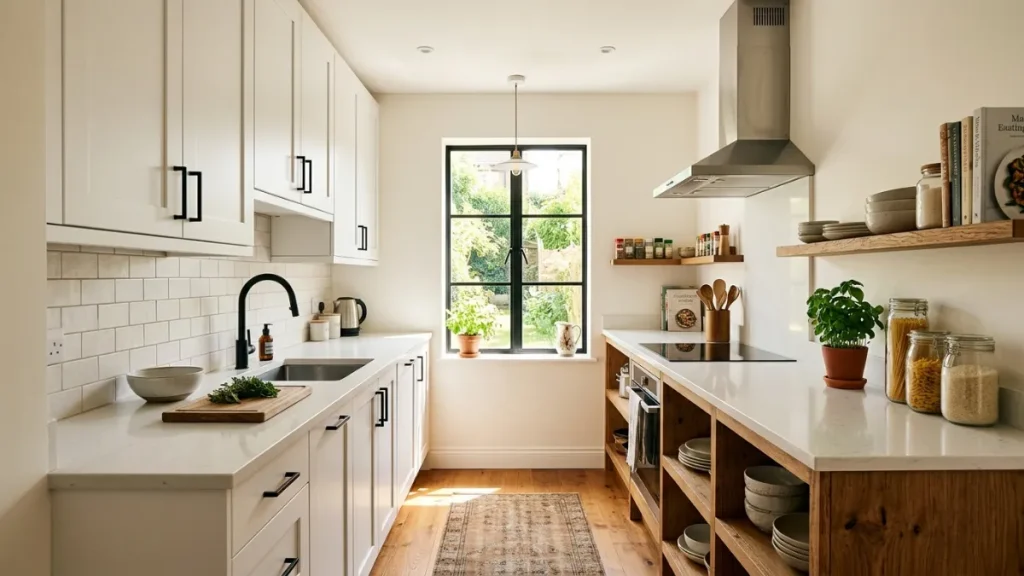 The galley kitchen is two parallel runs of cabinetry and countertop facing each other with a walkway in between. It is the most efficient layout in the world for a single cook, everything is within arm’s reach, and the work triangle is nearly perfect by design.