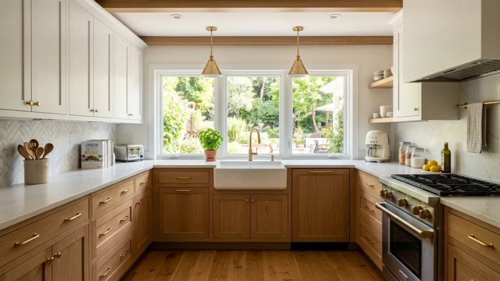 The L-shaped kitchen places cabinetry and countertop along two adjacent walls, forming an open corner. It is one of the most versatile layouts available because it works equally well in small spaces and large ones, and it naturally opens toward a dining area or living room in an open-plan home.